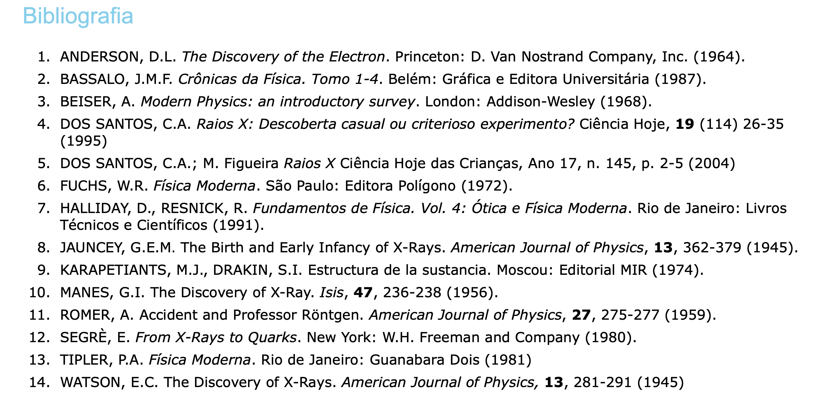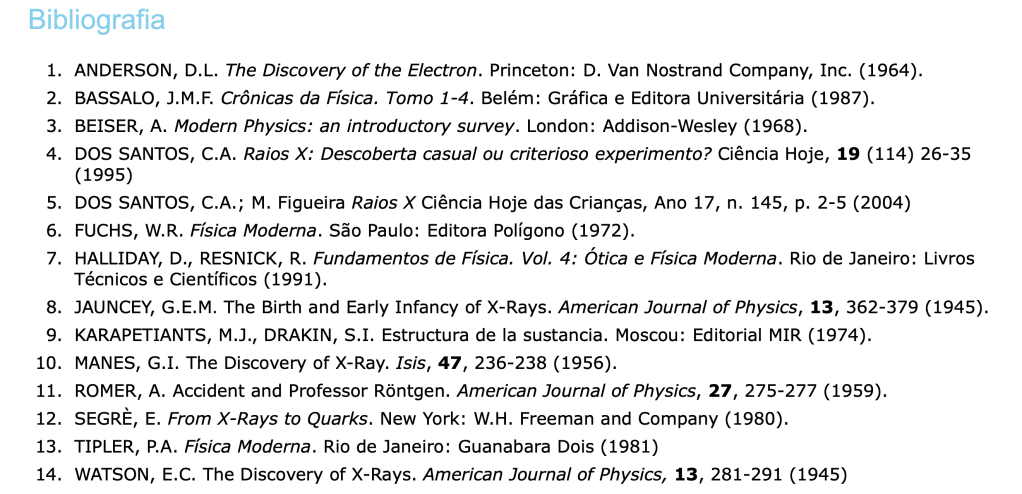 Claro! O site do Instituto de Física da UFRGS, mantido pelo professor C. A. dos Santos, oferece materiais didáticos sobre a história da ciência, incluindo a descoberta dos raios X. A seguir, apresento uma bibliografia baseada exclusivamente nesse site: