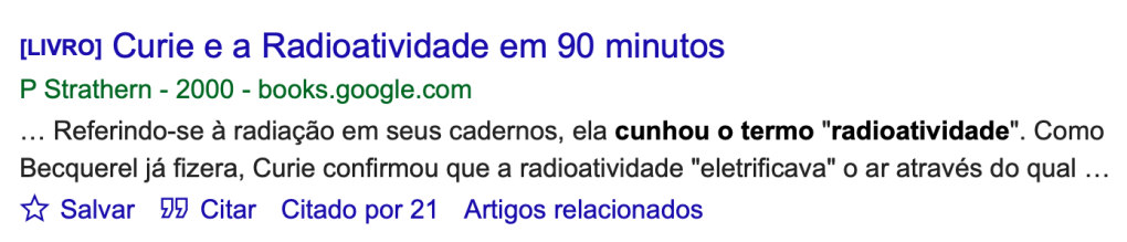 Enfim, por alguma razão probabilística, o algoritmo se fixou na expressão cunhou o termoradioatividade, e não conseguiu identificar o endereço do IF-UFRGS como o primeiro a mencionar que foi Marie Curie quem cunhou o termo. Na verdade, quem primeiro fez essa menção foi Roberto de Andrade Martins, no artigo que foi praticamente transcrito no portal do IF-UFRGS: Como Becquerel não descobriu a radioatividade, Caderno Catarinense de Ensino de Física 7 (1990) 27-45.