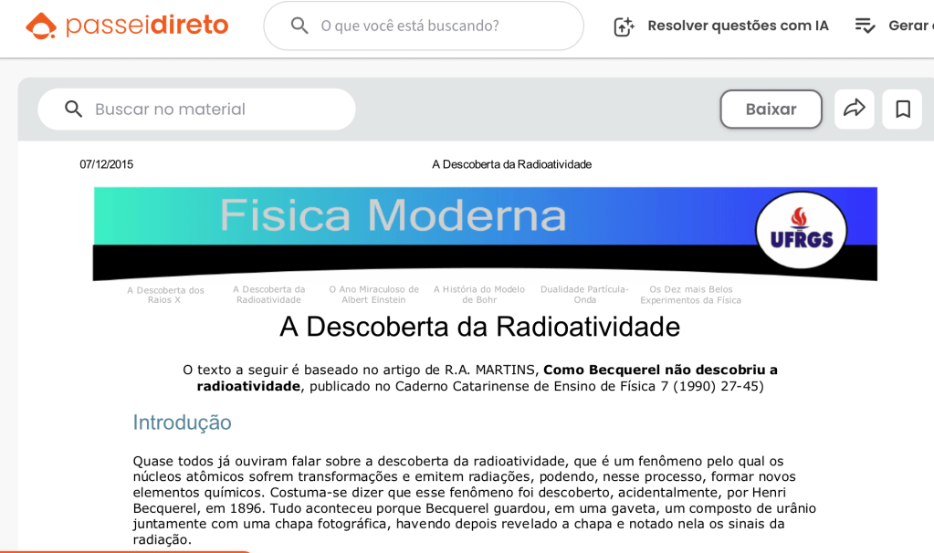 Para apresentar fontes sobre a importante questão de que substâncias fosforescentes (como sais de urânio) poderiam emitir radiações semelhantes aos raios X, o algoritmo sugere que visitou o visitou o portal “Toda matéria” (https://www.todamateria.com.br/), mas ao clicar no link fornecido pelo algoritmo, Toda Matéria+3if.ufrgs.br+3if.ufrgs.br+3, chega-se à página contina na demanda: https://www.if.ufrgs.br/tex/fis142/fismod/mod06/m_s02.html. Aparentemente, o algoritmo informa que comparou as informações contidas no endereço da demanda com as do portal “Toda matéria”. Mas, a demanda era que ele se restringisse ao endereço do IF-UFRGS.